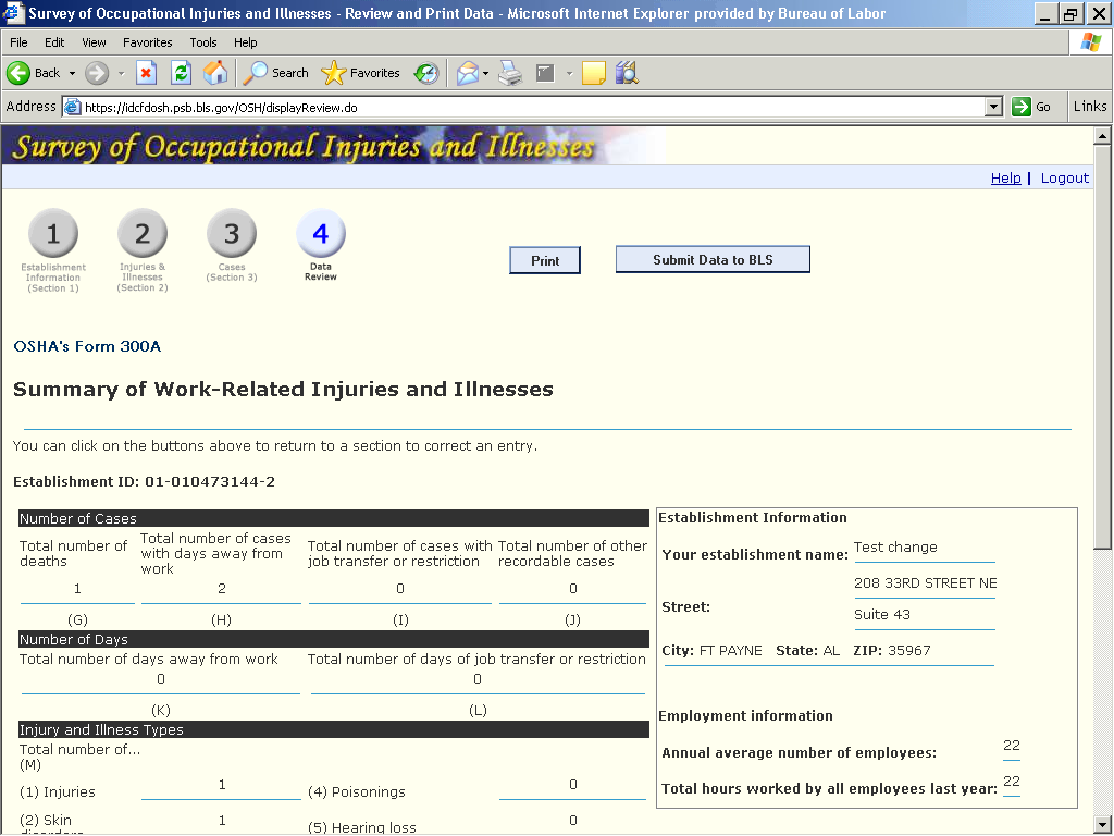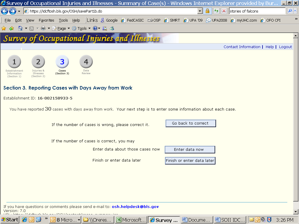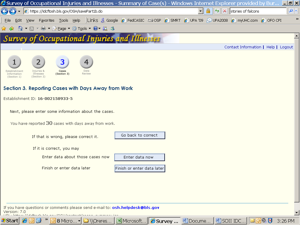 Three users clicked Continue and were taken to the Data Review page, thereby inappropriately by-passing the Cases with Days Away from Work pages. One of these users realized his mistake and used the top navigation on the Data Review page (see Figure 8) to return to Section 3 and correct his mistake.