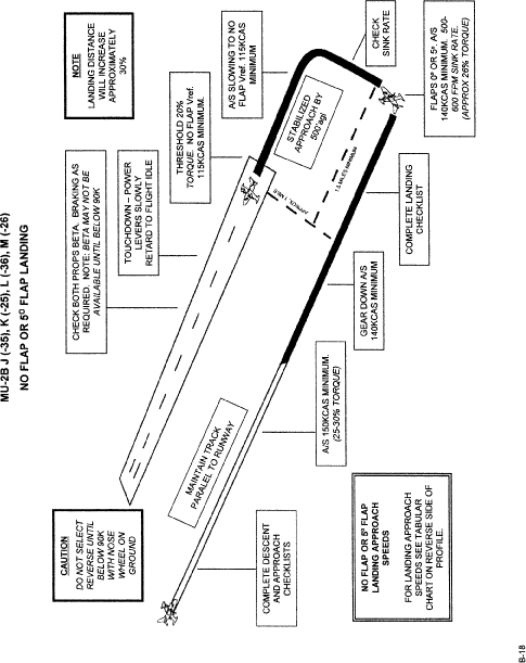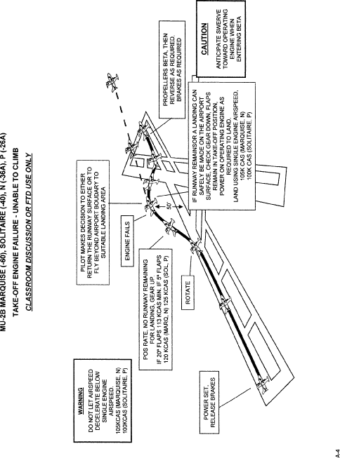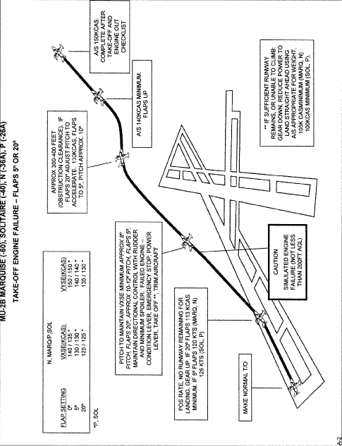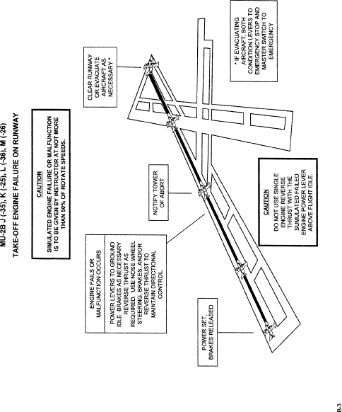 (B) In all takeoff profiles the prompt for the gear to be retracted is “No Runway Remaining, Gear Up”. This should set the decision point for making a landback after an engine failure and should normally be reached at altitudes of less than 100 ft AGL. It is impractical to attempt a landback from above 100 ft AGL, because it can require distances up to 10,000 ft from the beginning of the takeoff run to bring the aircraft to a stop. But, even on very long runways, landback will not be necessary above 100 ft AGL and above Vyse for the flap configurations, if the single engine climb capability found in the POM charts, with the gear up, is positive (250 fpm or better) and obstacles clearance is not an issue.