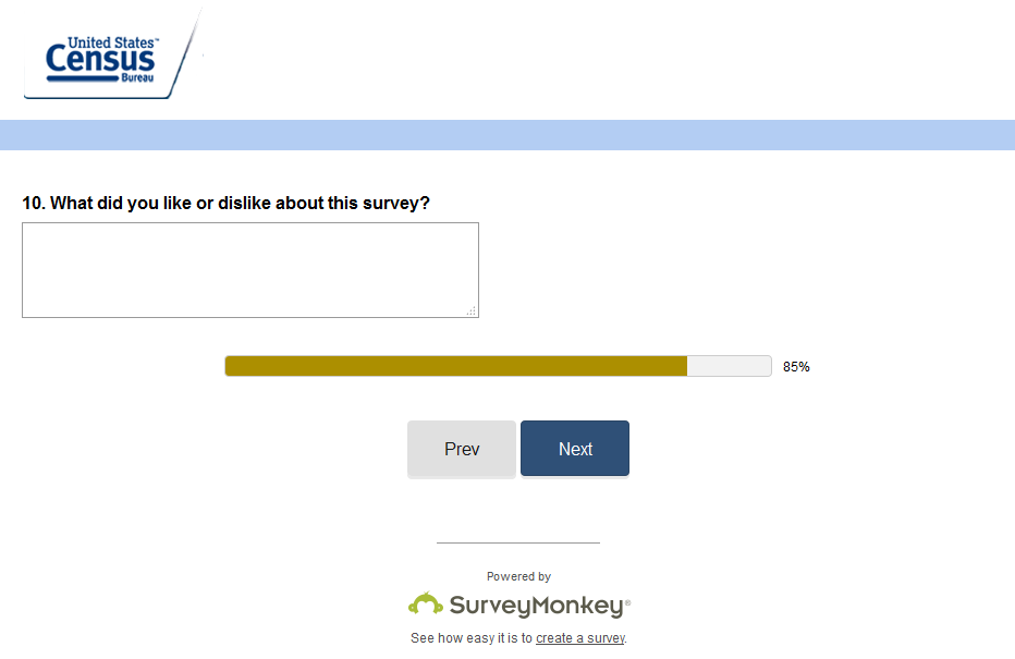 Your responses will not be shared with anyone in a way that could personally identify you. Your participation in this study is voluntary. The legal authority under which this information is being collected is Title 13 U.S.C. Chapter 5 Sections 141 and 193. This data collection is approved under OMB No. 0607-0978 and the approval expires 04/30/17. This data collection uses third-party web site to collect data. This survey does not collect personally identifiable information. The results from this survey will be used to conduct primary research to enhance planning efforts for current and future surveys and censuses.