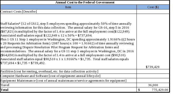 14. Provide estimates of annualized cost to the federal government. Also, provide a description of the method used to estimate cost, which should include quantification of hours, operational expenses (such as equipment, overhead, printing and support staff), and any other expense that would have been incurred without this collection of information. You may also aggregate cost estimates for Items 12, 13, and 14 in a single table.
