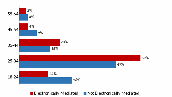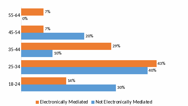Figure 1: Distribution of participants’ ages by whether they reported electronically mediated work.
