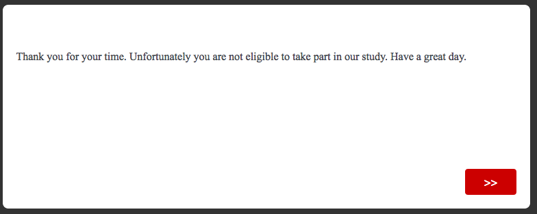 Thank you for your time. Unfortunately you are not eligible to take part in our study. Have a great day.