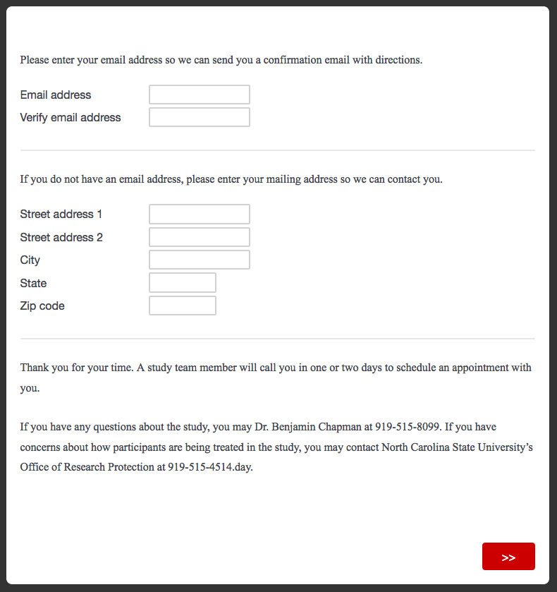 If you have any questions about the study or need to reschedule or cancel, you may contact [NAME] at [PHONE NUMBER]. If you have concerns about how participants are being treated in the study, you may contact North Carolina State University’s Office of Research Protection at 919-515-4514.