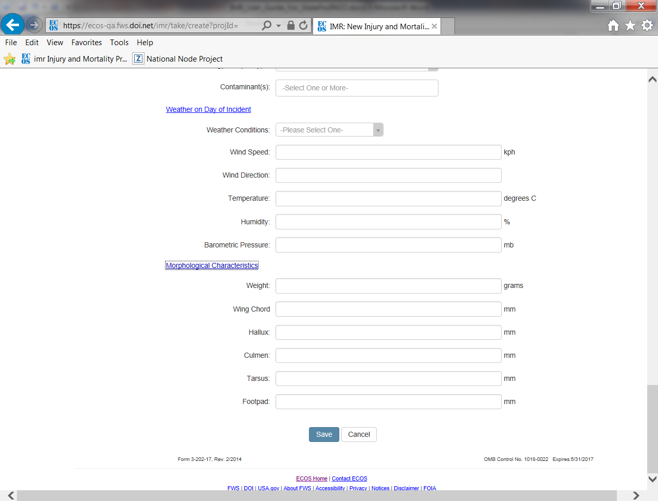 If the user opens the form from the Project summary view (above) the project field will automatically be populated with the project name. However, if the user chooses the “My Records” menu option and decides to create records that way, they will have to select the project they’ve created from the drop down menu on the injury/mortality report form. Again, it is not required that you associate a record with a project. The injury/mortality form has a total of 12 required fields. These must be filled out before the record can be saved. The full form including all fields is included on the next few pages.