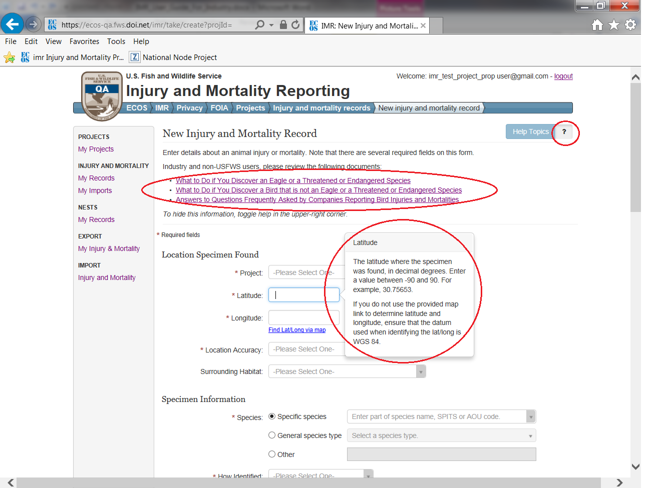 IMR contains help for each field (pictured below for the “latitude” field) that will help users know what’s expected for that field. Help is also provided above the form, including links to any appropriate guidance documents or other relevant information. As seen below, several guidance documents are provided including guidance for: