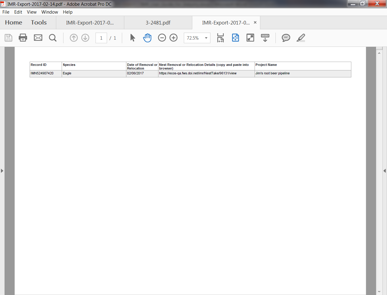 The Excel version of the summary is formatted as pictured below. Anyone listed as a Project User on the project can view the full details associated with the record by copying and pasting the hyperlink pictured below in column E into their web browser. The user will be prompted to log into IMR to view the record details: