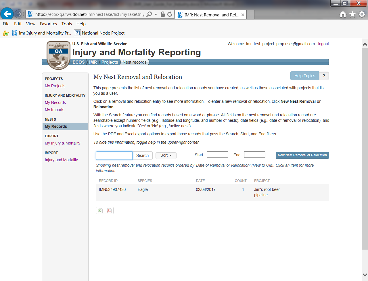 Creating a Nest Removal/Relocation Record and Exporting a Record Summary