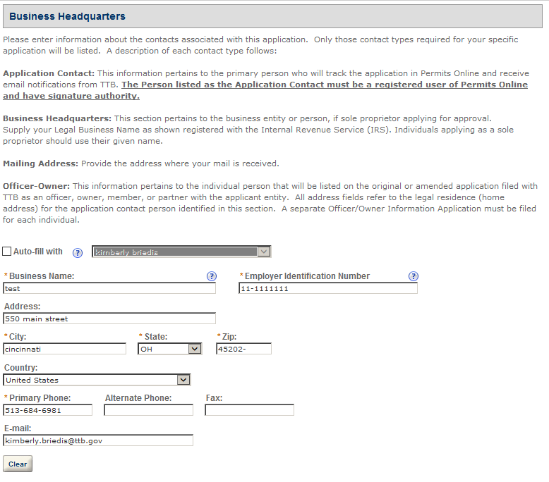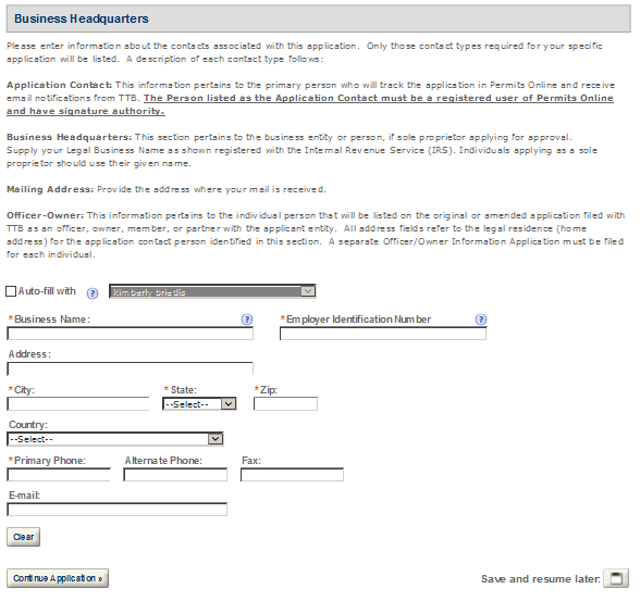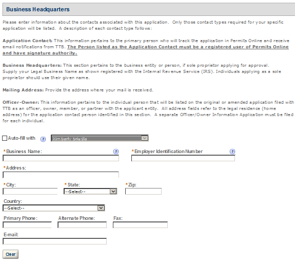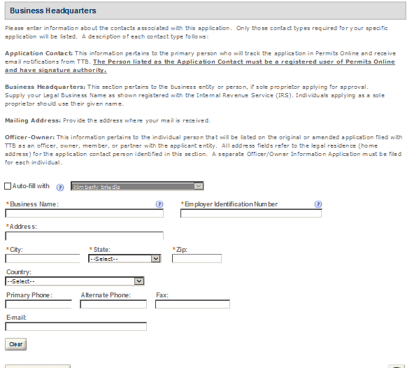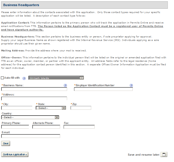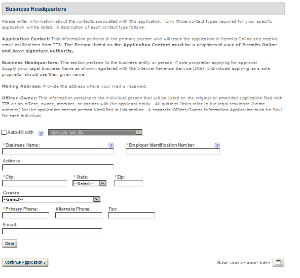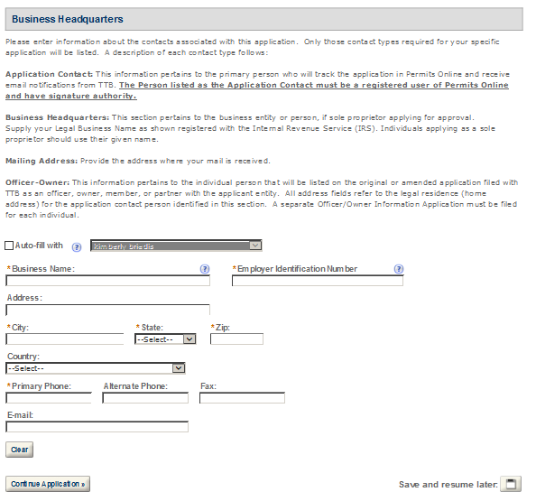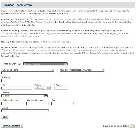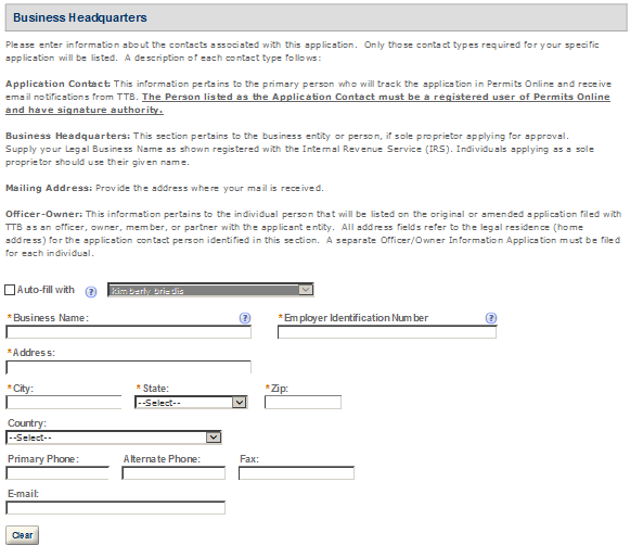 Business Headquarters - This contact includes information about the primary person within the applicant company with whom TTB will, if necessary, conduct a phone interview about the proposed operations. This person must have signing authority on behalf of the applicant business, and cannot be a consultant.