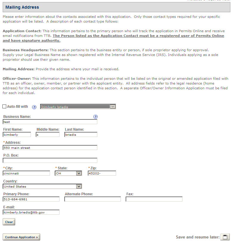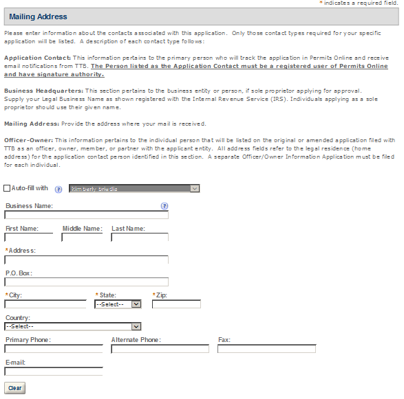 Mailing Address – This contact includes information about the address where you would like to receive mail from TTB.