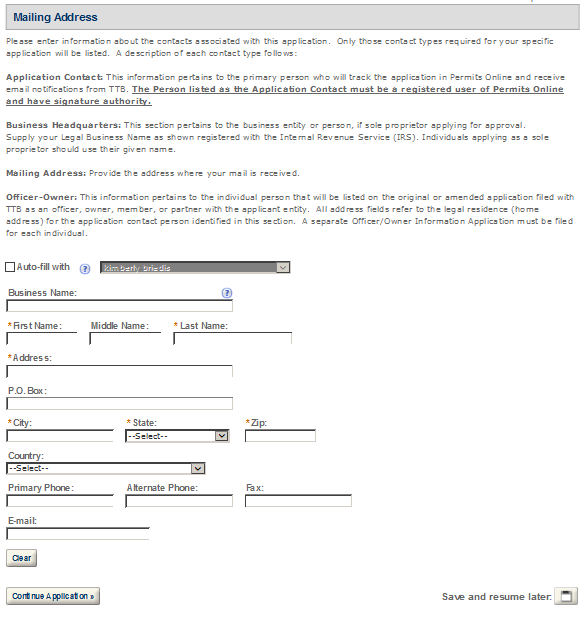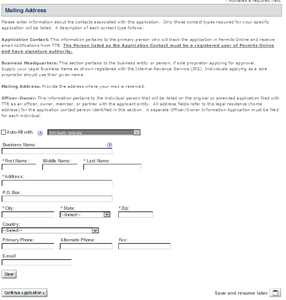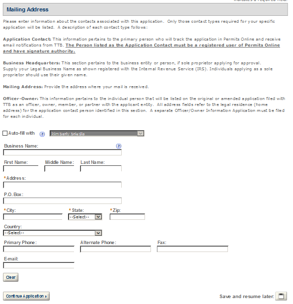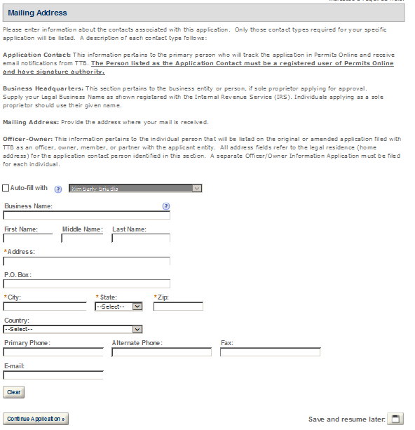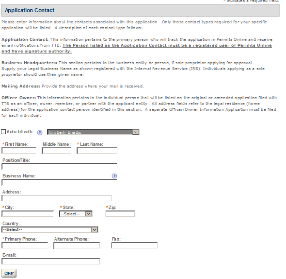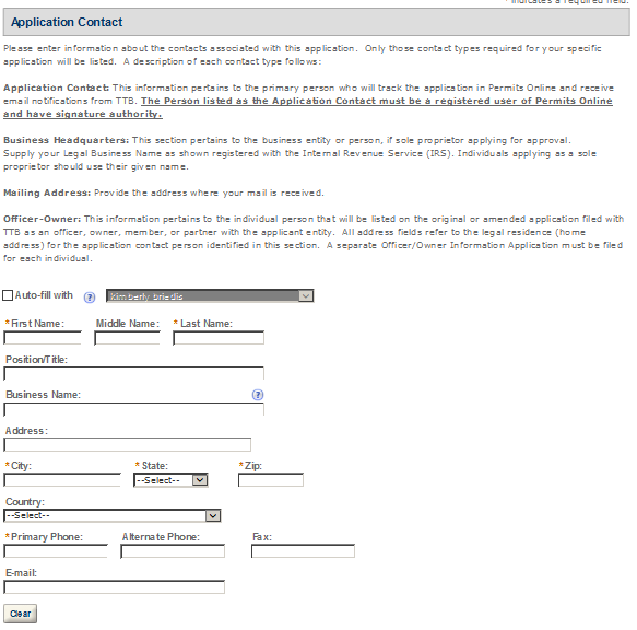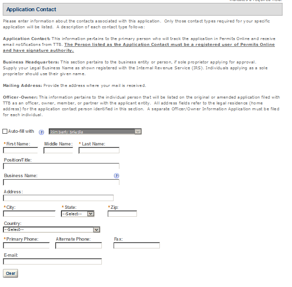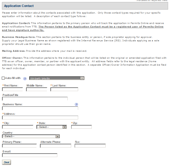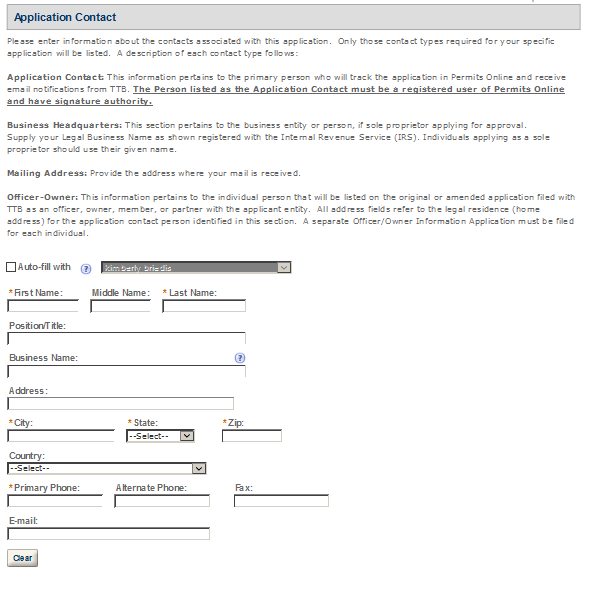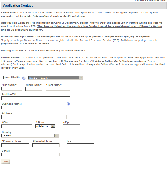Application Contact - This contact is the primary person with whom TTB will discuss application information and who will receive email notifications from TTB about the submitted application. This may be a consultant or an owner, officer, or other employee representing the applicant company. We recommend at least one Owner or Officer be added as an Application Contact. See “Adding Additional Application Contacts.”