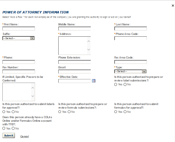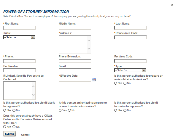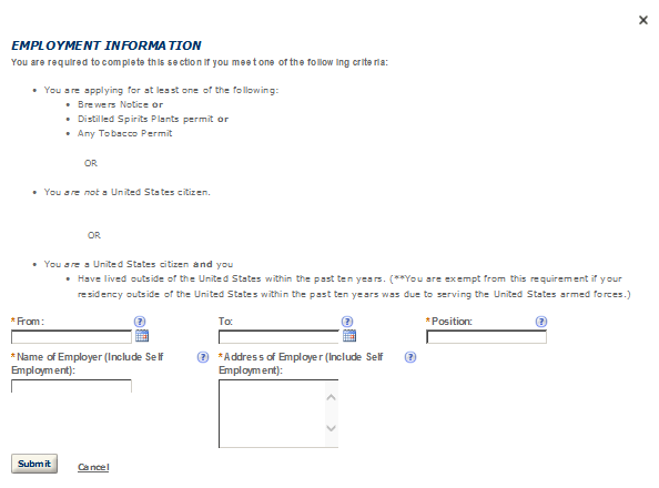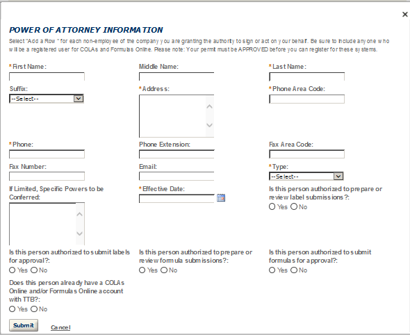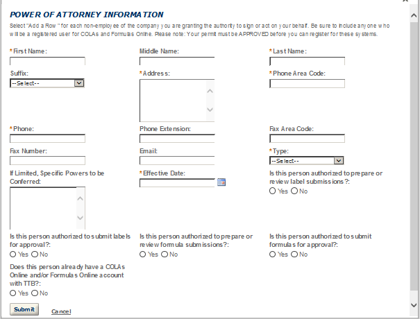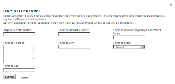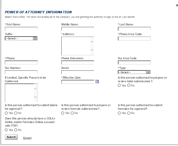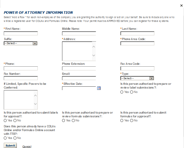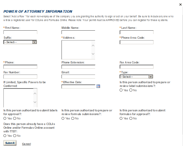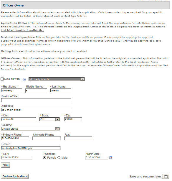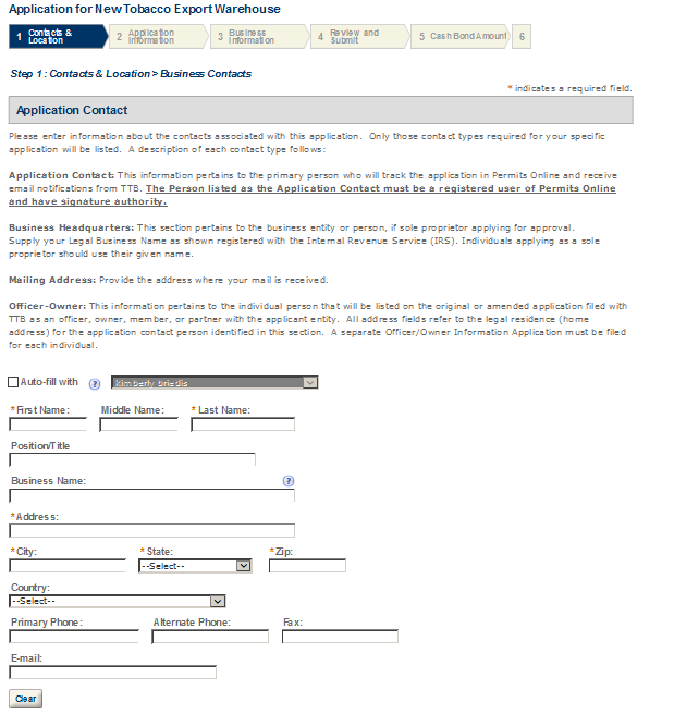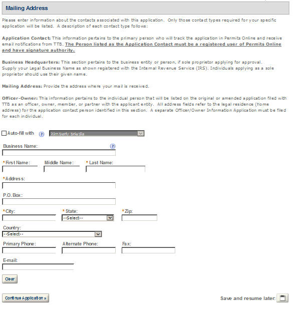 Application Contact - This contact is the primary person with whom TTB will discuss application information and who will receive email notifications from TTB about the submitted application. This may be a consultant or an owner, officer, or other employee representing the applicant company. We recommend at least one Owner or Officer be added as an Application Contact. See “Adding Additional Application Contacts.”