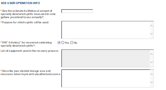 Specially Denatured Spirits User Application Tracking Number (assigned at submission) |