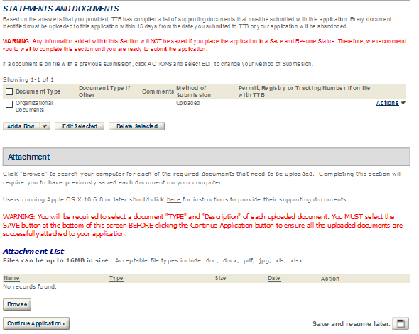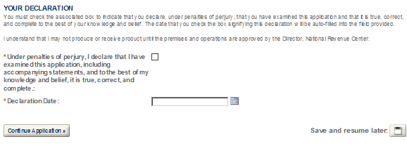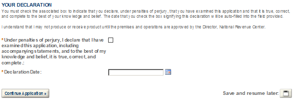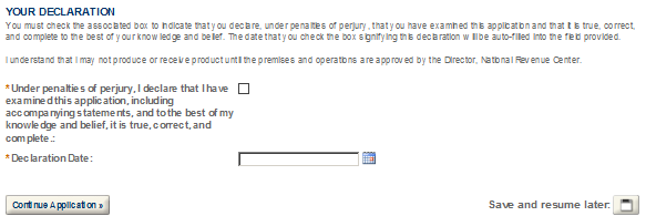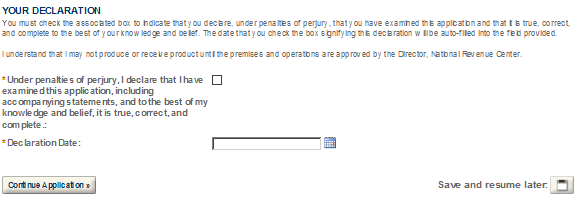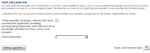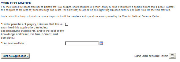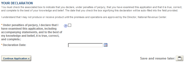 After completing the application, you will have the opportunity to review the application information one last time. After you have ensured the application contains accurate information, click the “Continue Application” button. You will immediately receive an email stating TTB has received your application and be given an Application Tracking Number.