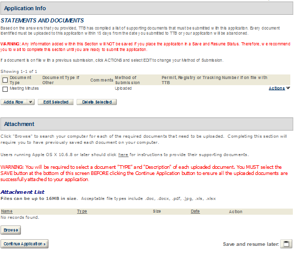 The “Save and Resume Later” option works only if you have completed all of the required fields (and related information sections and tables) up to the point where you leave the application. Do not use “Save and Resume Later” on amended applications as it will not save your information. Once you click “Save and Resume Later”, you will be taken to the “Search For Applications” screen. The application (with a Temporary Tracking Number) at the top of the page will be the application you just saved for later completion. Write down the Temporary Tracking Number of that application.