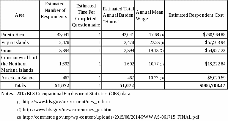 Estimates for number of hours per response are based on reasonable estimates of the time needed to read the census questionnaire, the accompanying information sheets, and other materials; to gather, organize, and summarize information; and to record answers on the data collection instrument. These estimates reflect input from cognitive testing conducted in Puerto Rico. Overall, respondent cost for FY 2017 is estimated at $906,709. Table 2 details the estimated respondent cost by island.