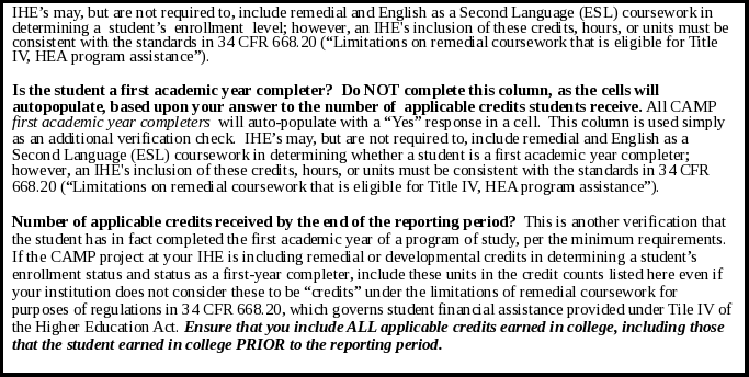 | Student Name | Student Identification Number | Was the student enrolled at the IHE in the CAMP program with full-time status during all academic terms of the regular academic year (i.e. all terms other than summer) in which he or she was a CAMP participant? (Yes/No) | Is the student a first academic year completer? (DO NOT COMPLETE - COLUMN AUTO-POPULATES) | Number of Applicable Credits Received by the End of the Reporting Period | |||||||||||