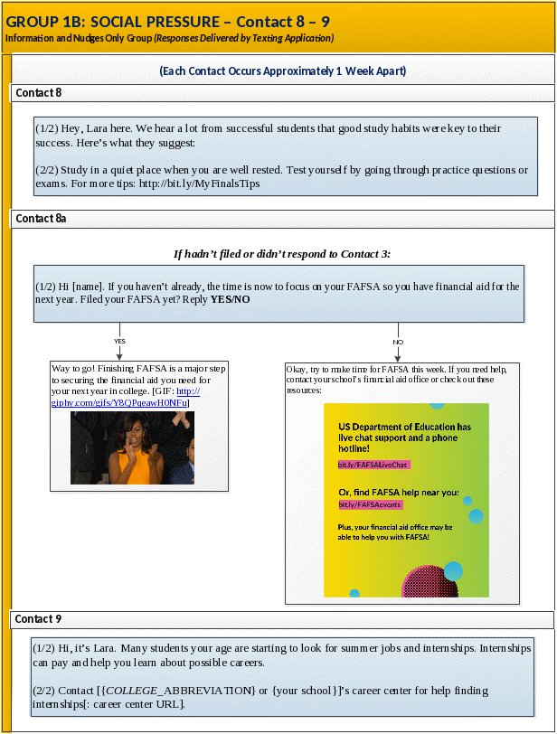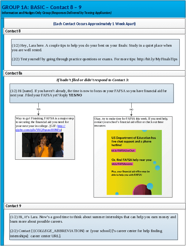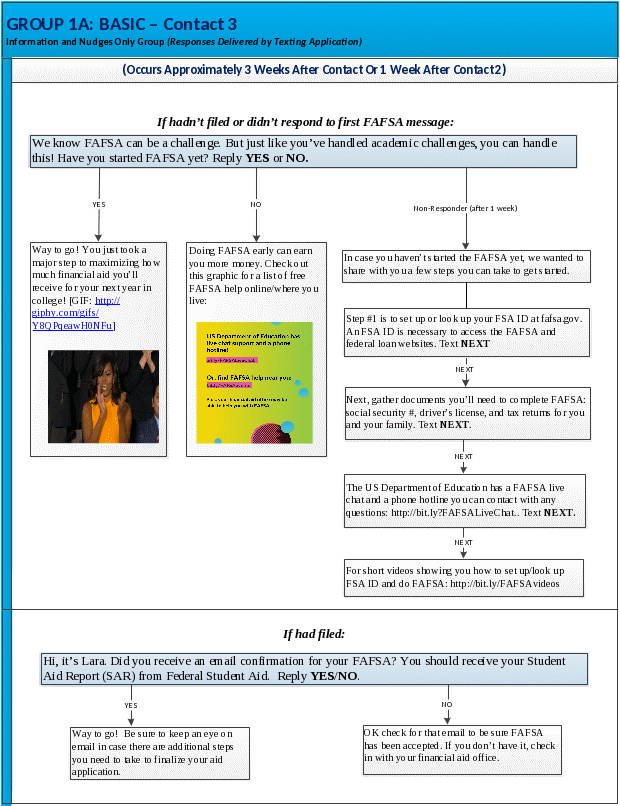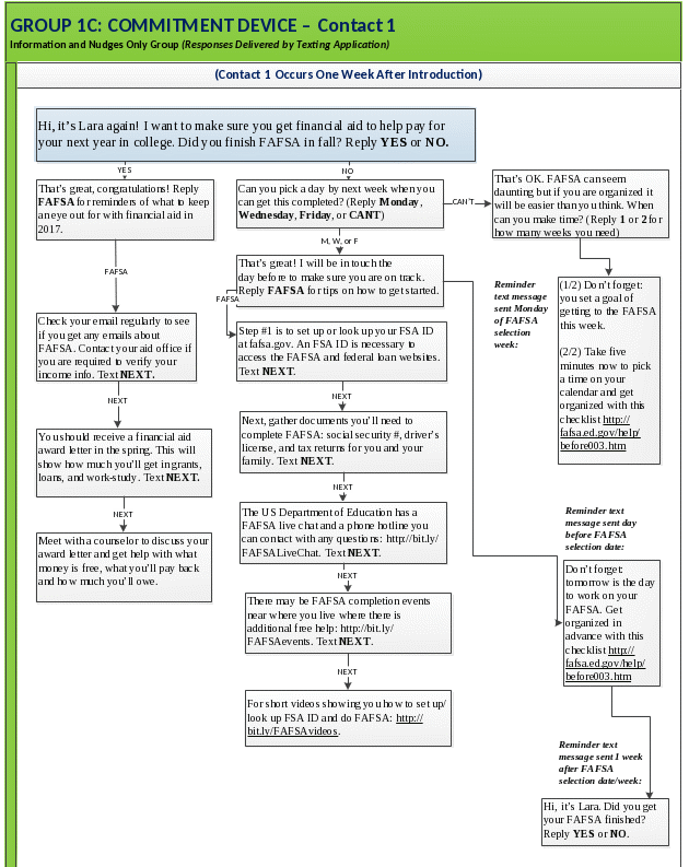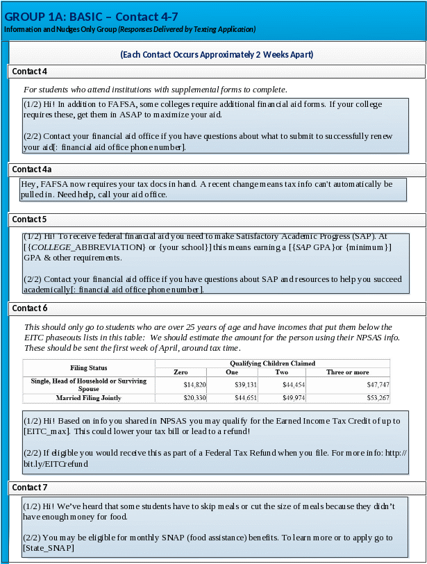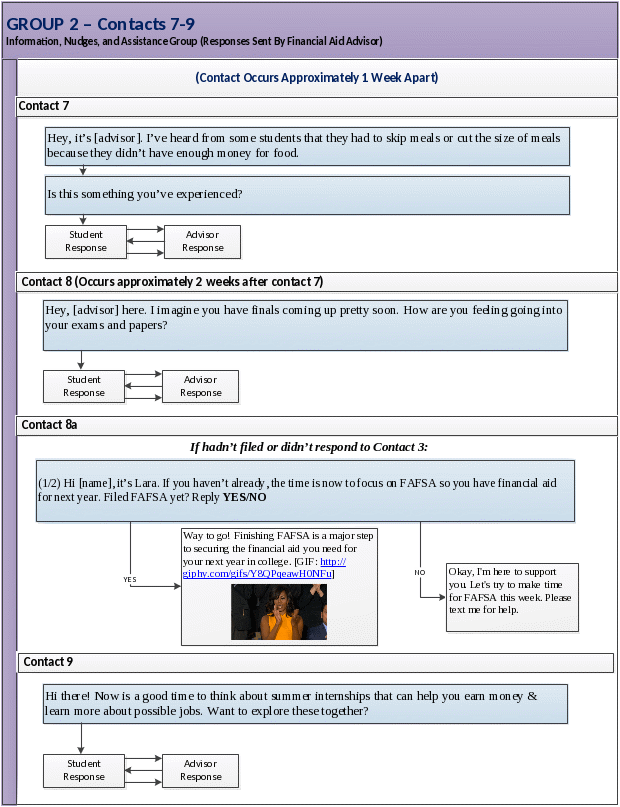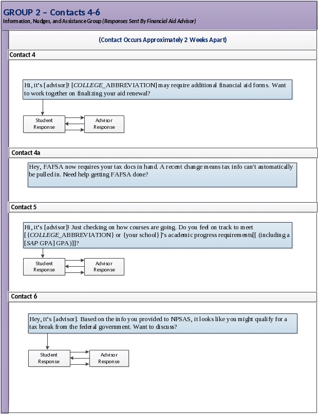 Group 2 – Information, nudges, and assistance. Students will receive initial text content similar to that received by students in Group 1. A financial aid advisor will respond to any replies and provide the student the opportunity to engage in a dialogue on financial aid topics.