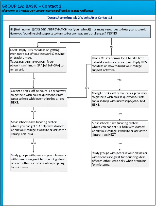 Group 1 – Information and nudges only. Students will receive automated and predetermined texts. Automated replies will be sent in response to key words included in texted responses from students. Group 1 includes three variations.