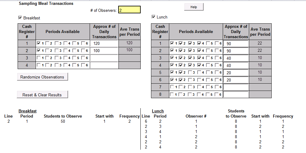 The example above shows the sampling results for breakfast (1 period, 2 cash registers and 120 daily transactions at one register and 100 daily transactions at the second register) and lunch (4 periods, 6 cash registers and the specified number of daily transactions at each register above).