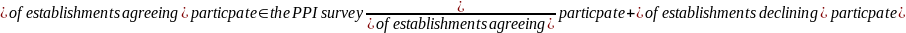 The PPI repricing response rate for estimation is an unweighted item based rate. The estimation response rate provides the percentage of items eligible for use in estimation and represents the actual response based on current potential for response. The numerator of this rate is the count of all items used in estimation and the denominator is the count of all items for which information was requested.