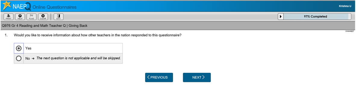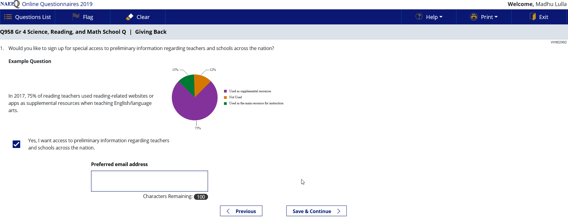 Ok, so [none/one/few/most/all] of you are familiar with NAEP and the data resources that NAEP provides. We are focusing today on NAEP data that could be valuable to you and sharing the NAEPQ Giving Back Website with you. Access to this website is provided to those who “opted in” when they completed the NAEP teacher or school survey. Beside your tablet, there is a copy of the opt-in question on the questionnaires, which you can review later when you are exploring the website. Once the website is launched, teachers and administrators are emailed a user name and password. The website was created to serve a number of purposes, but the most important one for this conversation is to provide informative feedback from the Teacher and School Questionnaires to educators.