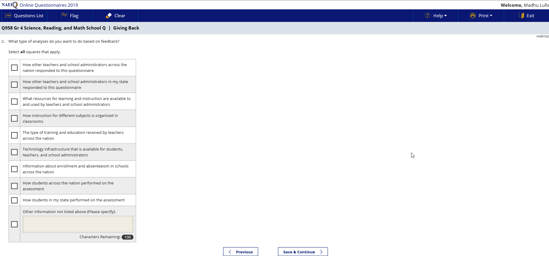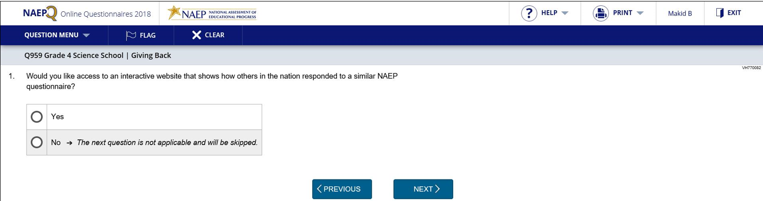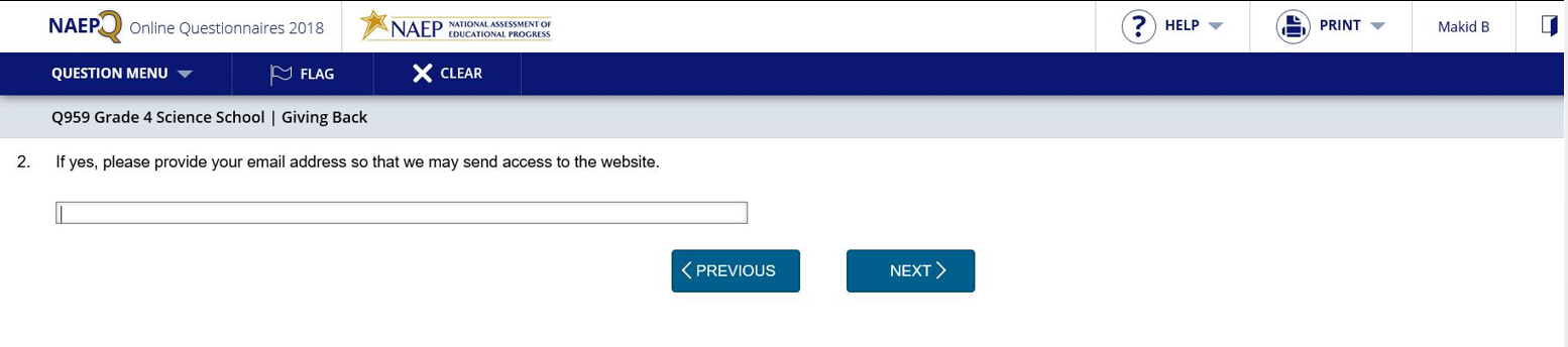 According to the Paperwork Reduction Act of 1995, no persons are required to respond to a collection of information unless it displays a valid OMB control number. The valid OMB control number for this voluntary information collection is 1880-0542. The time required to complete this information collection is estimated to average 90 minutes, including the time to review instructions and complete and review the information collection. If you have any comments concerning the accuracy of the time estimate, suggestions for improving this collection, or any comments or concerns regarding the status of your participation, please write to: National Assessment of Educational Progress (NAEP), National Center for Education Statistics (NCES), Potomac Center Plaza, 550 12th St., SW, 4th floor, Washington, DC 20024.