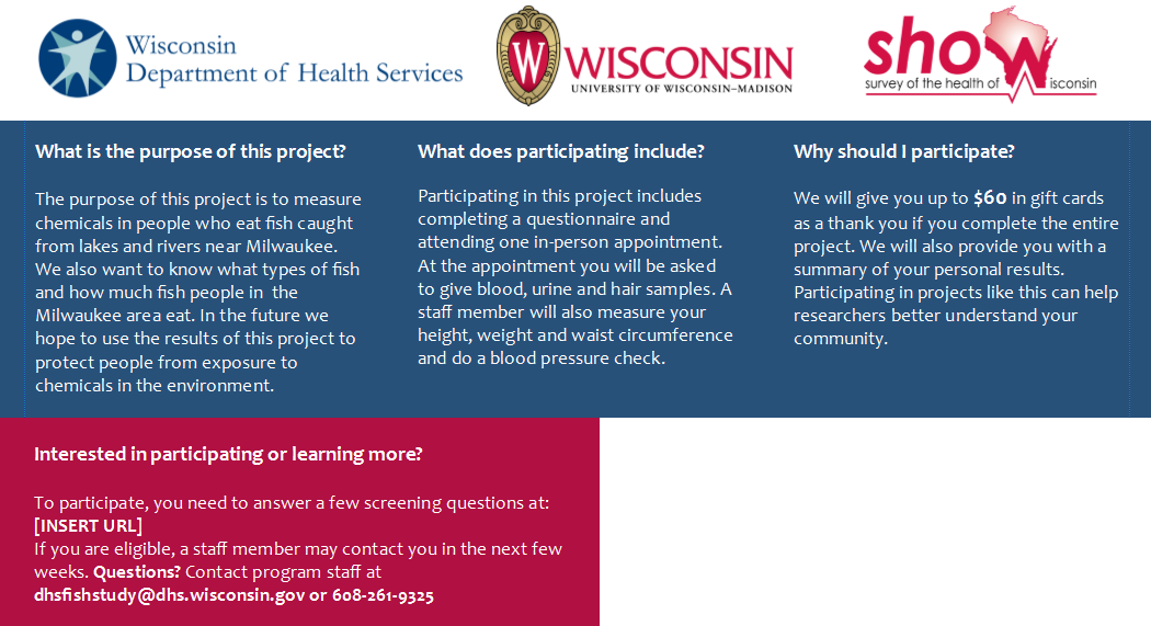 If you have questions please email dhsfishstudy@dhs.wisconsin.gov or contact Brooke Thompson at 608-261-9325.