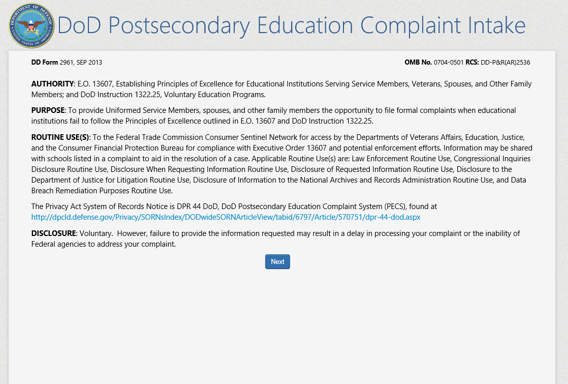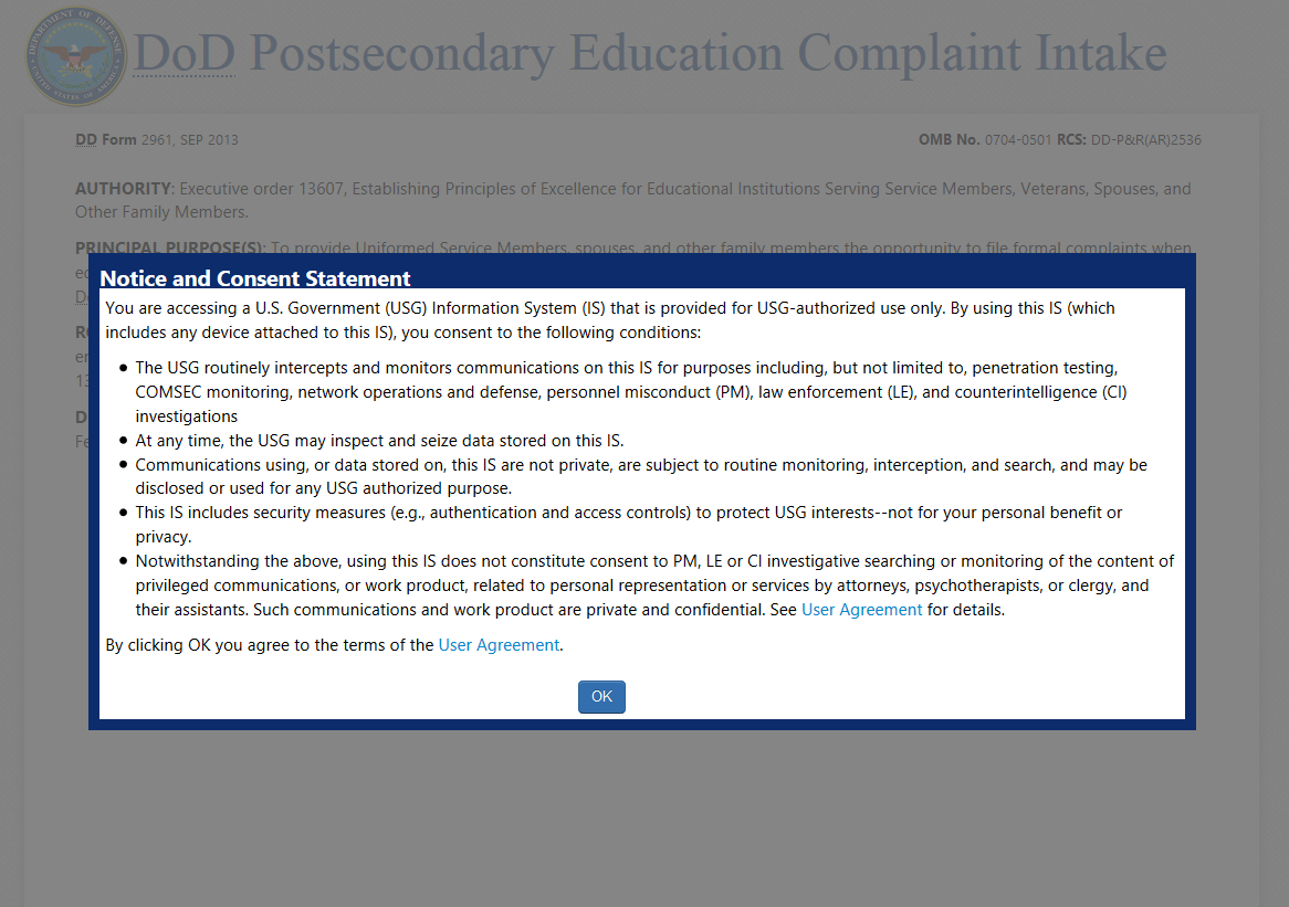The DoD Postsecondary Education Complaint Intake is accessed online by visiting the following URL: http://www.militaryonesource.mil/voluntary-education?content_id=274604. Upon accessing the DoD Postsecondary Education Complaint Intake URL users are presented with a Notice and Consent Statement. From the Notice and Consent Statement complaint filers have the ability to access the User Agreement or click “OK” to advance.