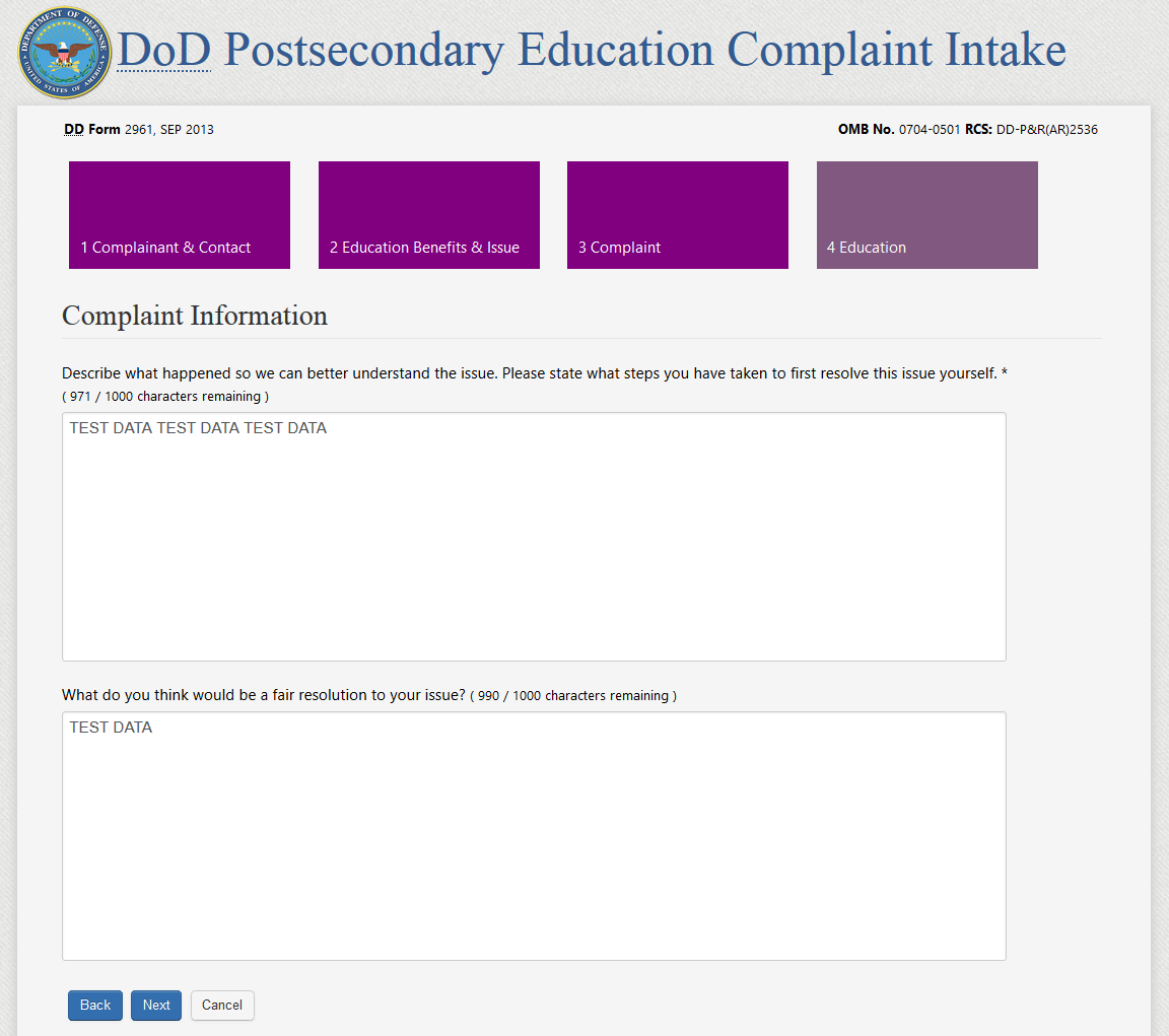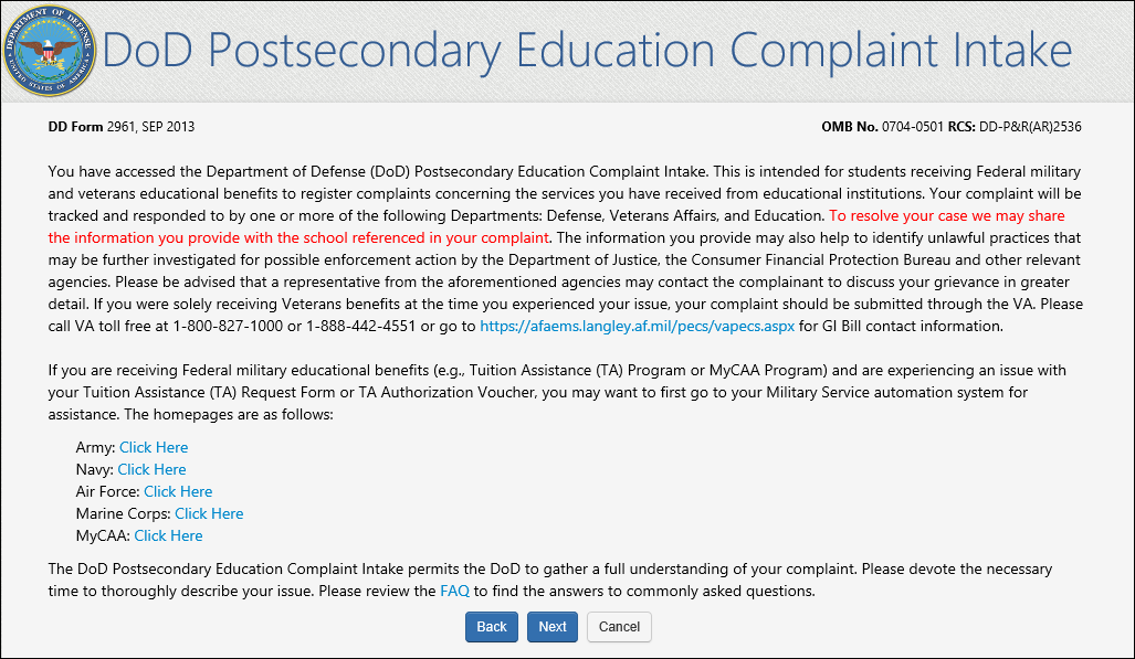 REQUIRED DOD POSTSECONDARY EDUCATION COMPLAINT INTAKE FIELDS