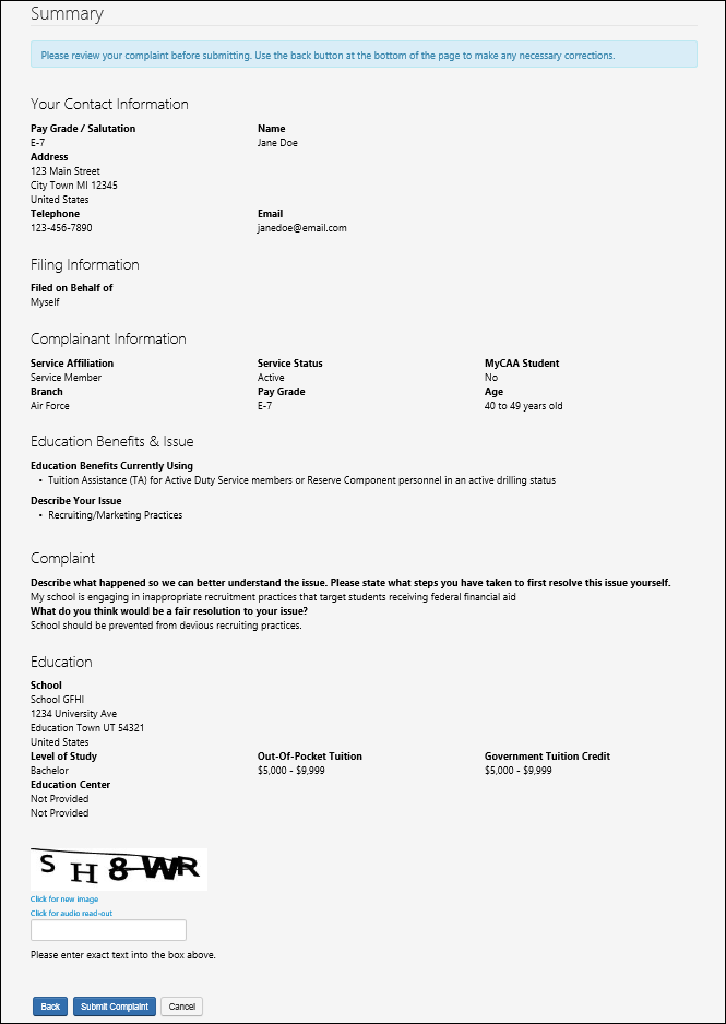 10. After entering the Education information a Summary page displays all the data entered by the complaint filer. The user has the option to either go back and edit their entries or submit the complaint. To submit the complaint, the user must successfully pass a CAPTCHA. NOTE: The Contact Information display has been reordered on the Summary Page. This is a new change to the DoD PECS Intake.