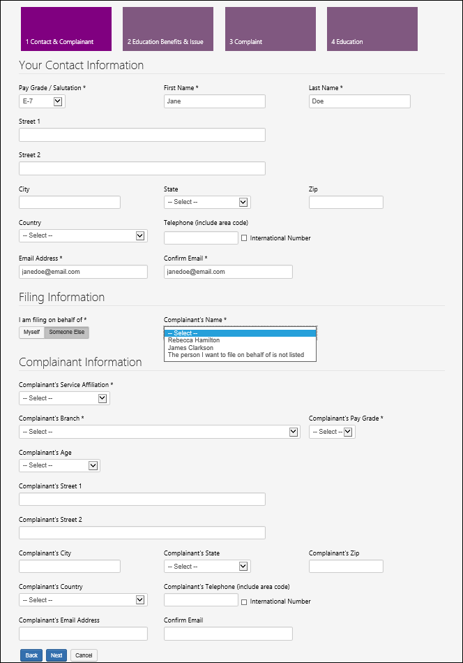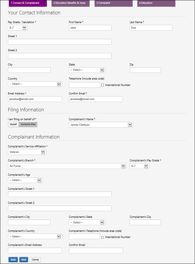 CONTACT & COMPLAINANT PAGE (FILING ON BEHALF OF SOMEONE ELSE – VETERAN)
