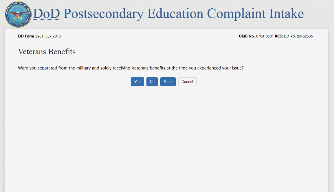 the complaint filer answers “No” to the Veterans Benefits