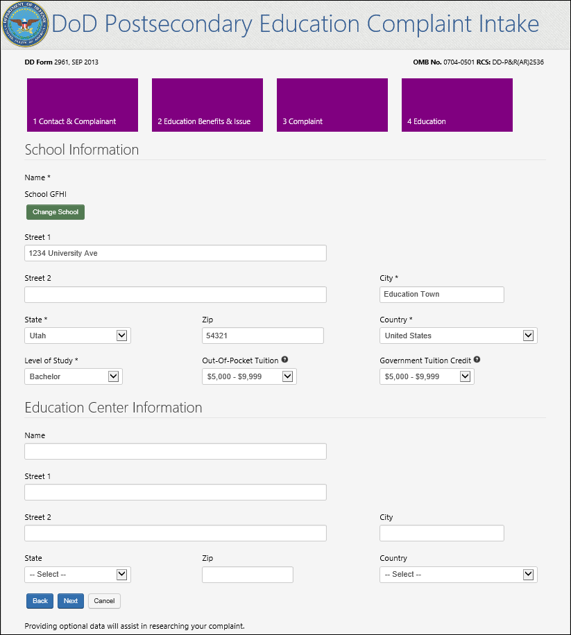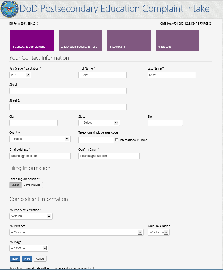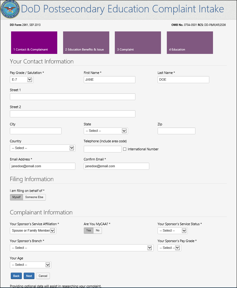 OPTIONAL DOD POSTSECONDARY EDUCATION COMPLAINT INTAKE FIELDS