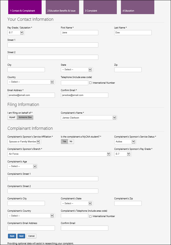 CONTACT & COMPLAINANT PAGE (FILE ON BEHALF OF MYSELF – SERVICE MEMBER)