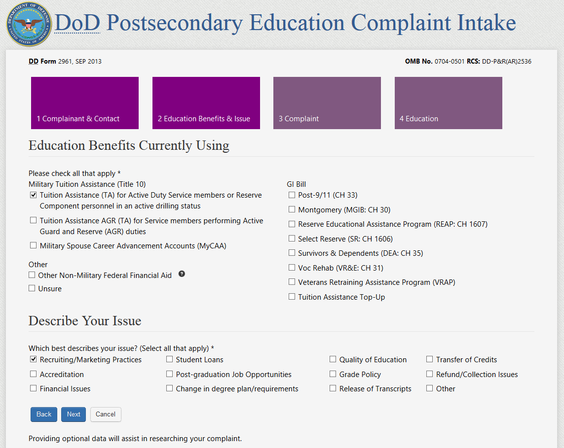 After clicking “Next” the complaint filer advances to Section 2 - the “Education Benefits & Issue” data collection page.
