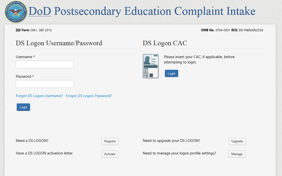 DS LOGON PAGE: DS LOGON IS A NEW AUTHENTICATION METHOD BEING INTEGRATED INTO THE DOD INTAKE. This page is developed and managed by DS Logon; and though DS Logon is a separate application, its integration into the PECS Intake will be seamless to the user. DS Logon requires the user to authenticate either by Common Access Card (CAC) or by DS Logon username/password.