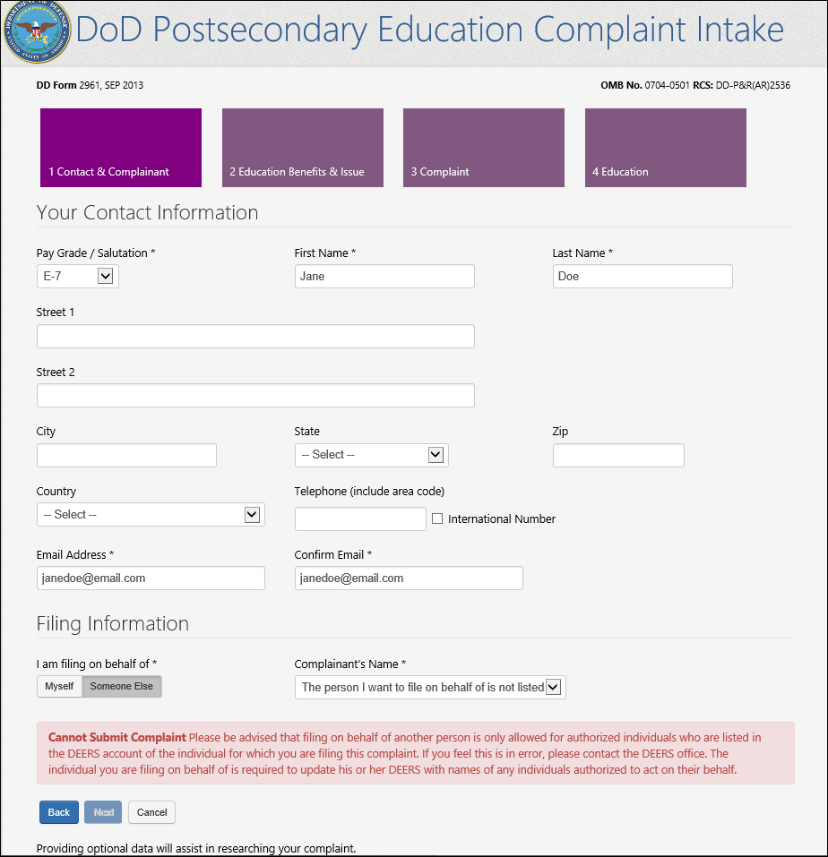 7a. If the user elects to file on behalf of someone else and the DEERS record does not identify them as being authorized to file a complaint on the individual’s behalf, a message will display on the page directing them to the DEERS office. NOTE: The message “cannot submit complaint” stopper is a new addition to the DoD PECS Intake behavior.