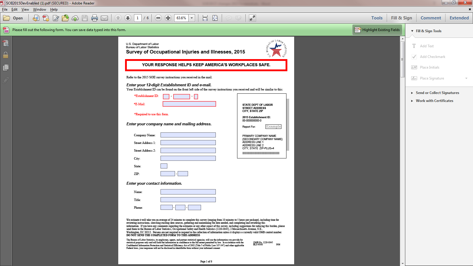 Thank you for contacting the Bureau of Labor Statistics to request an electronic version of the Survey of Occupational Injuries and Illnesses. A fillable PDF of the survey form is attached to this e-mail.