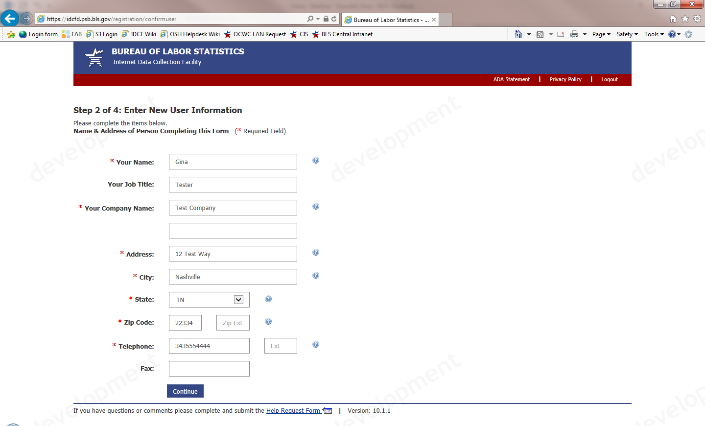 After submitting the help request, the user will return to Section 1 and press “Save and Continue” to proceed through the survey…