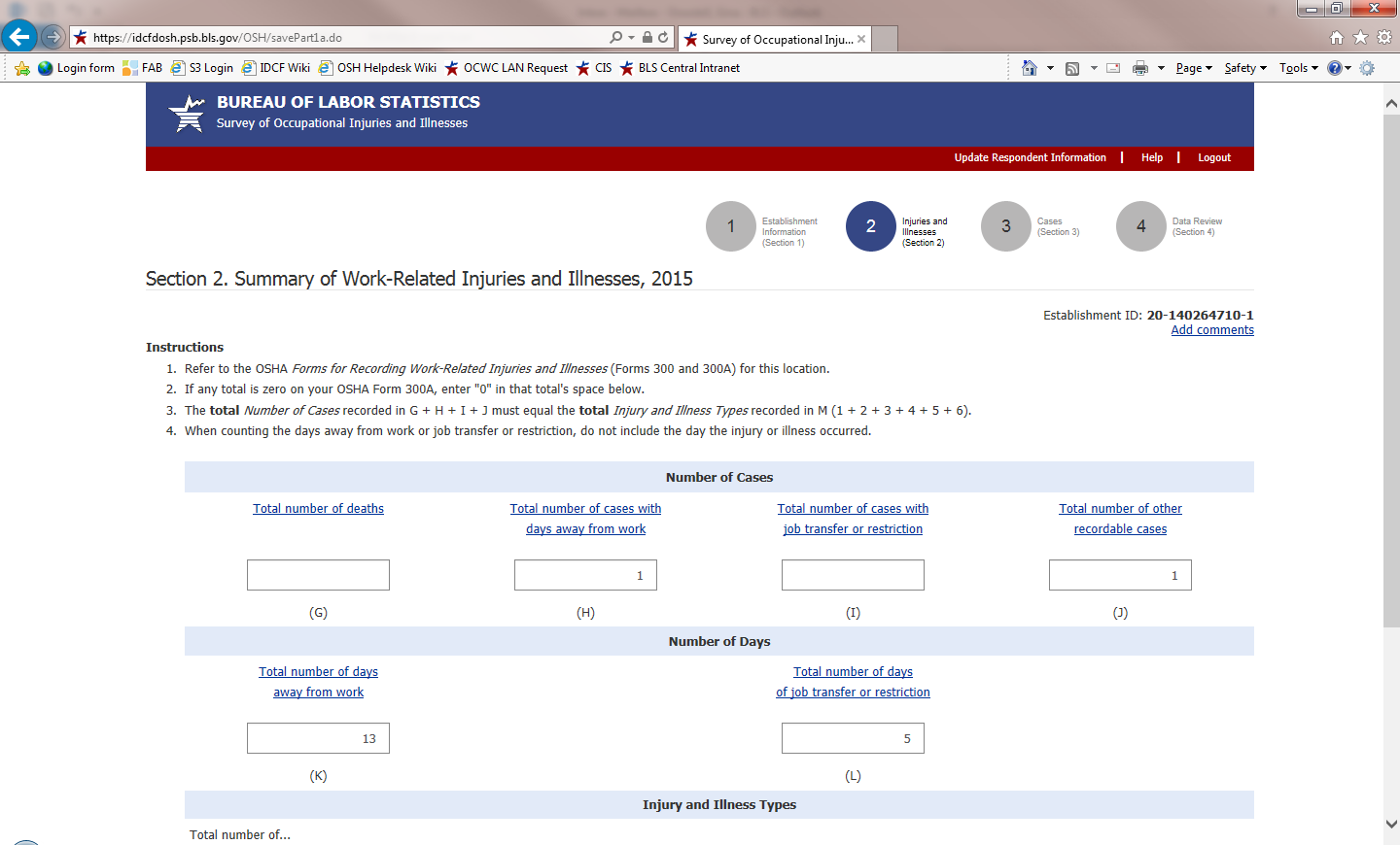 2. Enter your establishment's identifying information (establishment ID, address, and contact information), and then enter your establishment's injury and illness data.