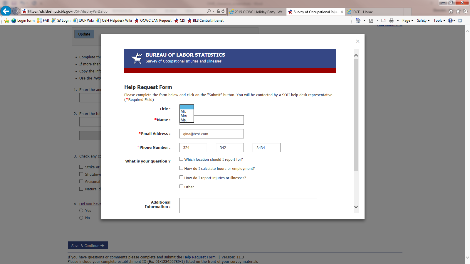 From screen above, or any screen within the survey, users can click on the “Help Request Form” link on the bottom of the page to send a question to the helpdesk. This form is shown below. This year we added a Salutation drop down so that our helpdesk staff can address users properly: