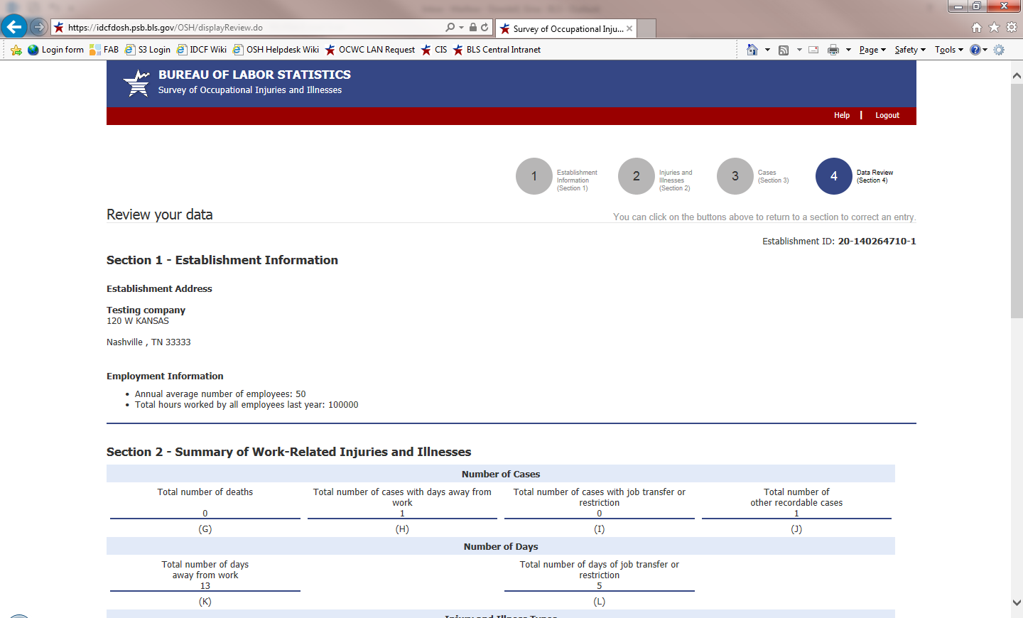 2. Enter your establishment's identifying information (establishment ID, address, and contact information), and then enter your establishment's injury and illness data.