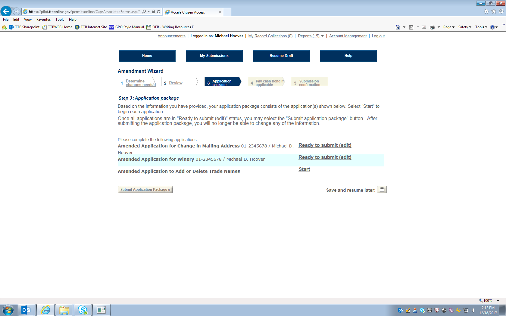 Figure 23 – Screen showing that all basic permit amendment applications are ready to submit to TTB via PONL.