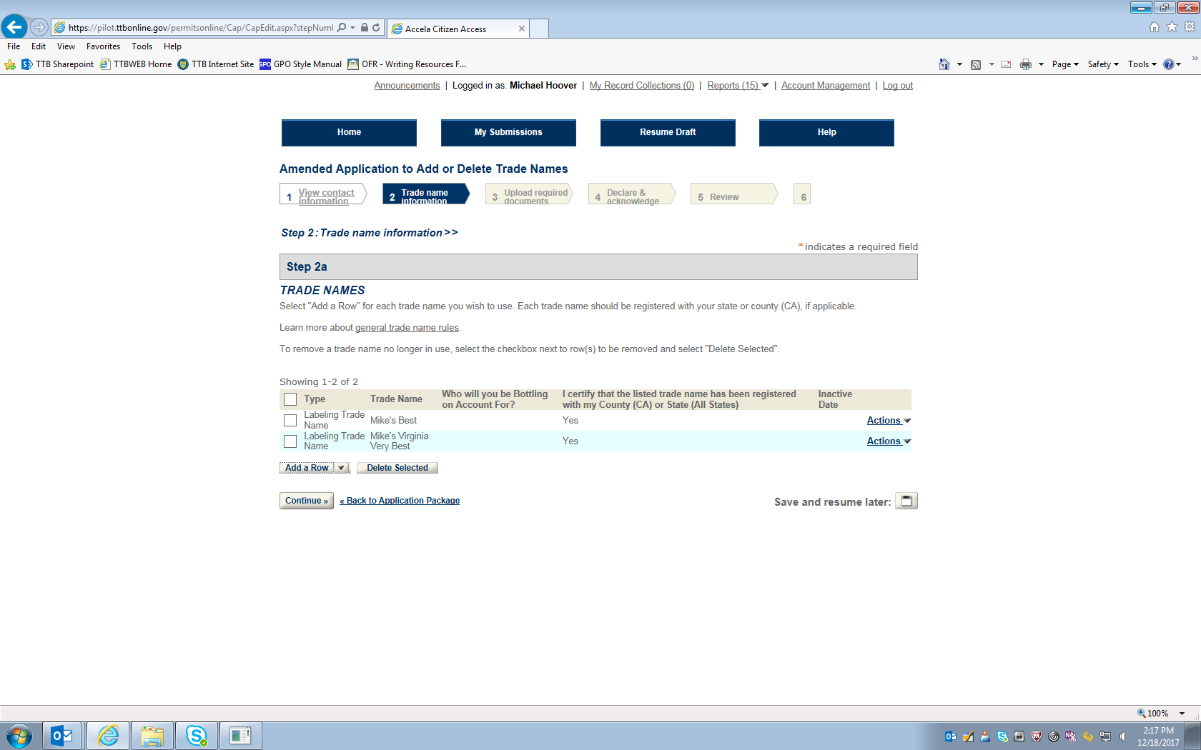 Figure 19 – On this screen the respondent adds or deletes trade names. In this example, the trade name “Mike’s Virginia Very Best” is being added.