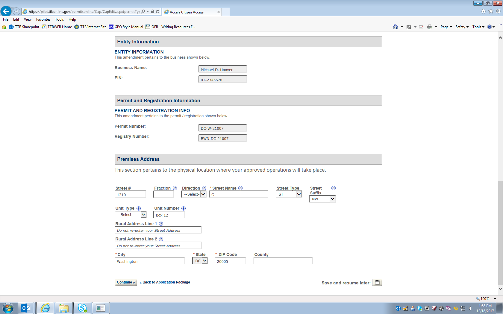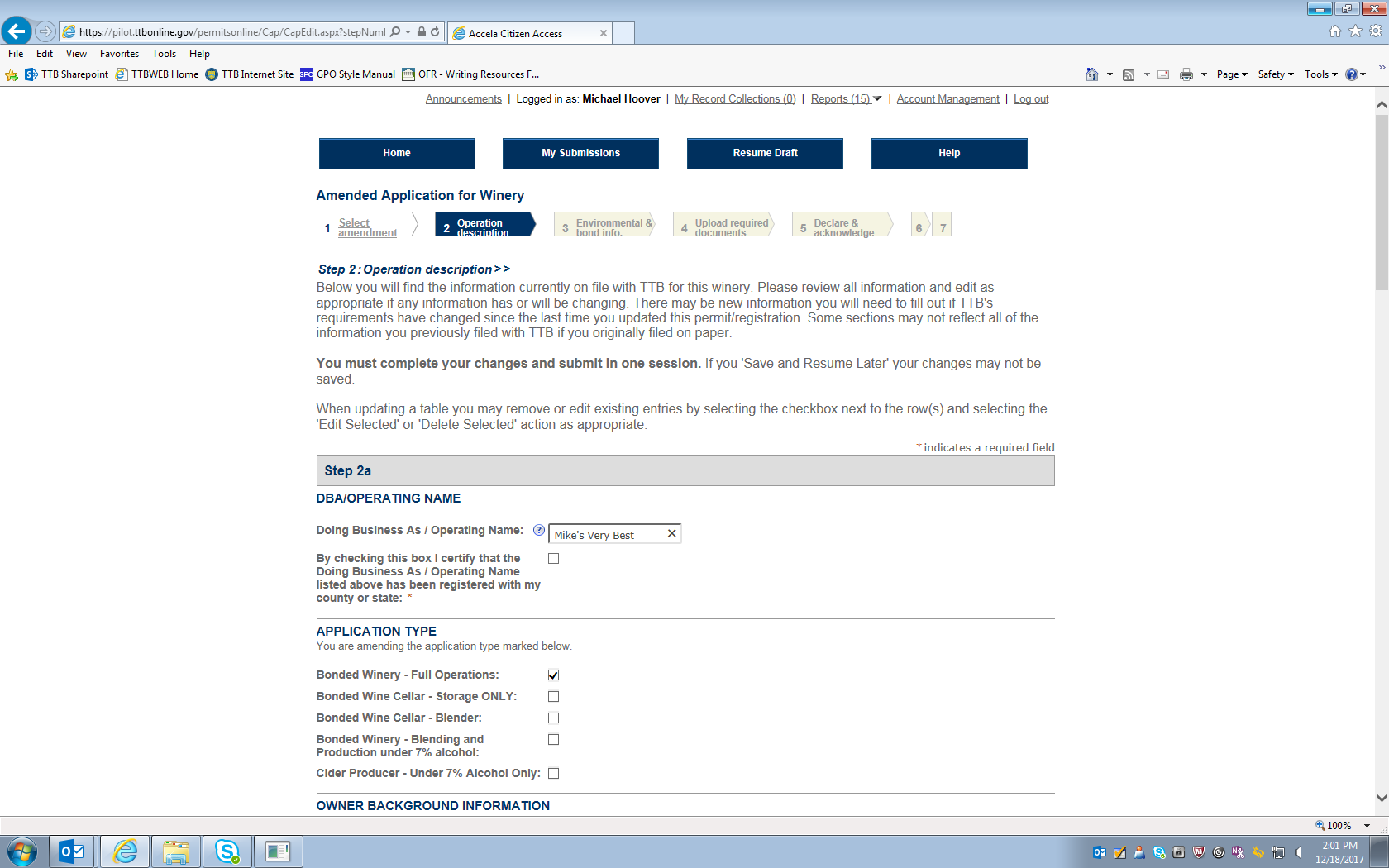 Figure 13 – This screen (which continues on the next three pages below) shows the current information for the winery in question, and the respondent may amend any of the stated information on this screen. In this example, the “Doing Business Name” is amended from “Mike’s Best” to “Mike’s Very Best.”