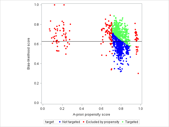 The green dots display the targeted cases. These cases have the highest importance scores (high values of a-priori propensity times bias-likelihood shown in the upper right corner) among the remaining eligible cases. The blue dots show the remaining eligible cases that will not be targeted. The horizontal line on each scatterplot represents the median bias-likelihood for that institution group.