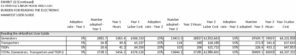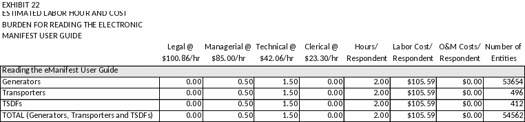 The burden for reading the e-Manifest User Guide is estimated to be 2 hours per reader per year. See exhibit 22.