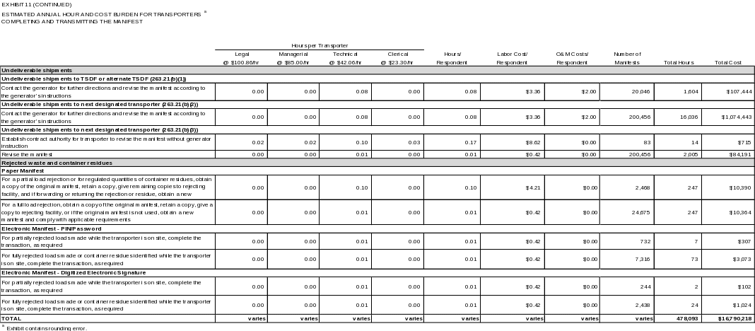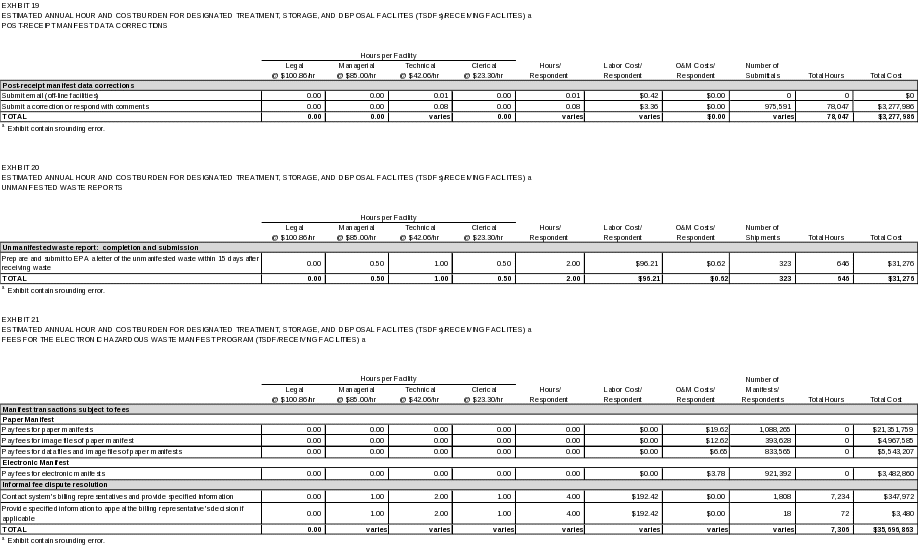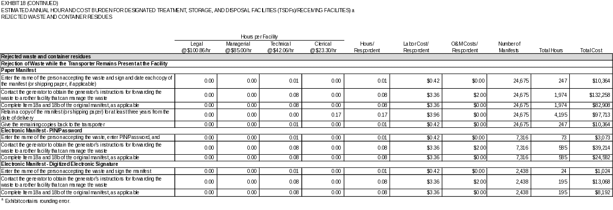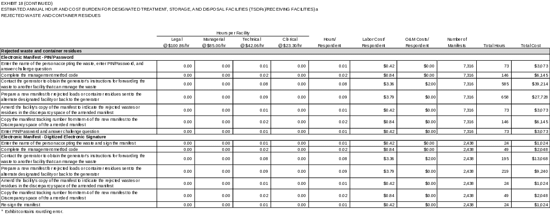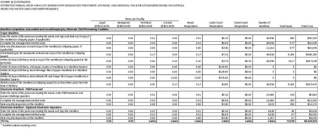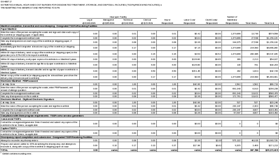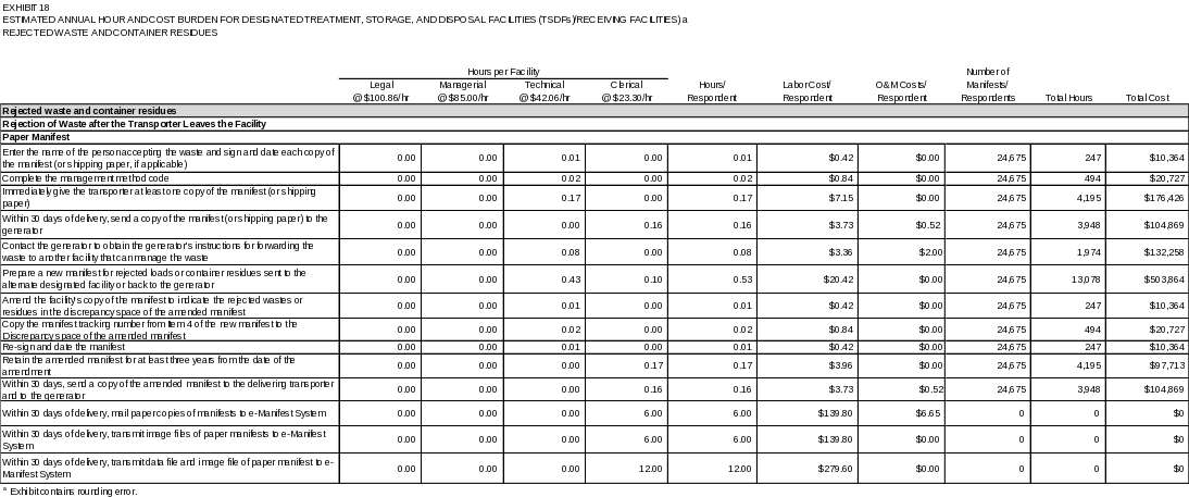 63 In other words, Exhibit 17 estimates submittal burden based on the number of facilities, not the number of manifests submitted. It is assumed that each facility will collect all manifests received during the month, including those accompanying rejected loads and container residues, and submit them in batch form to the national system.