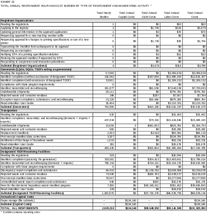 This ICR describes the hazardous waste manifest regulations, including the e-Manifest final rule and final fee rule. It also estimates the annual hour and cost burden to respondents and EPA under these requirements for both paper and electronic manifests.2