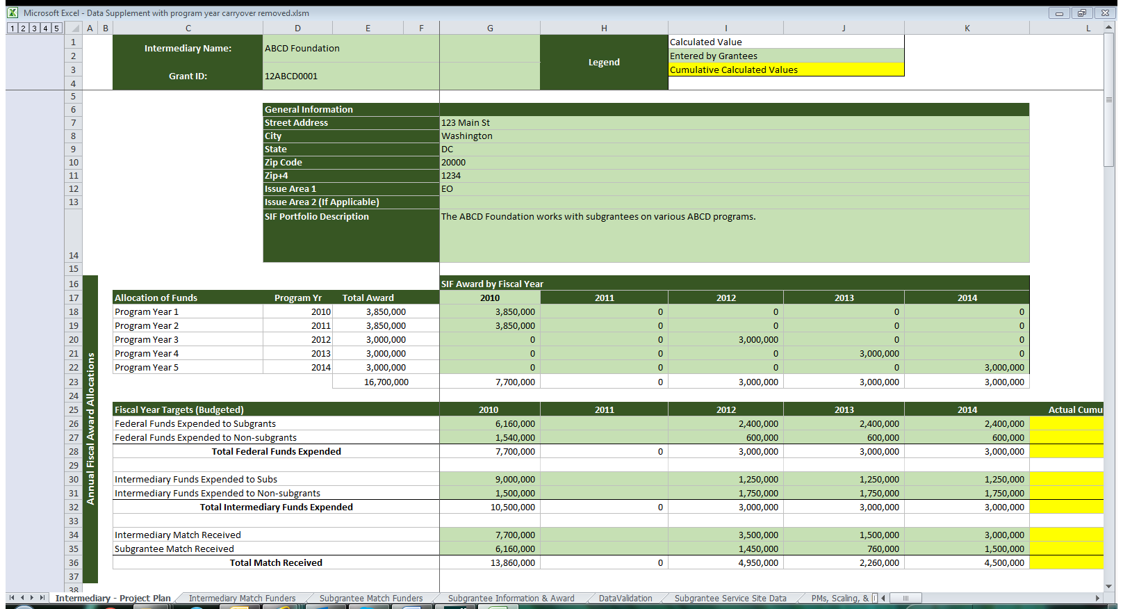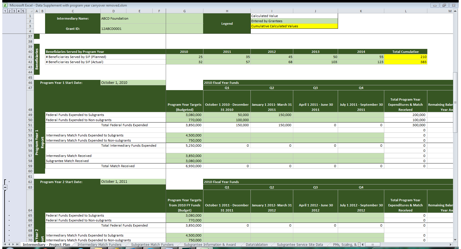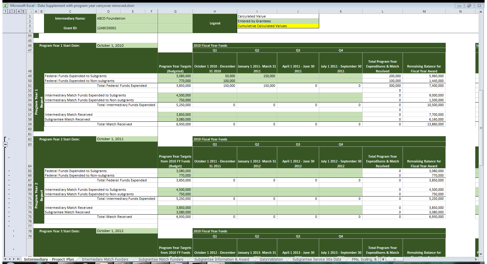 Cells are color coded to indicate cells that should be entered by grantees (light green) and those automatically calculated (white). Yellow highlighted cells are also calculations that are flagged for internal purposes, and need not be entered by intermediaries.